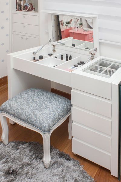 Quem tem orçamento folgado para gastar com o cantinho de maquiagem pode investir em bancadas com divisórias. Tampas que escondem as divisórias deixam o espaço organizado e clean.