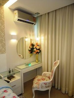 Pendurar uma cortina ou tecido comum atrás da penteadeira e pendurar também um cordão de luzes são alternativas para quem não pode mexer na estrutura do cômodo.