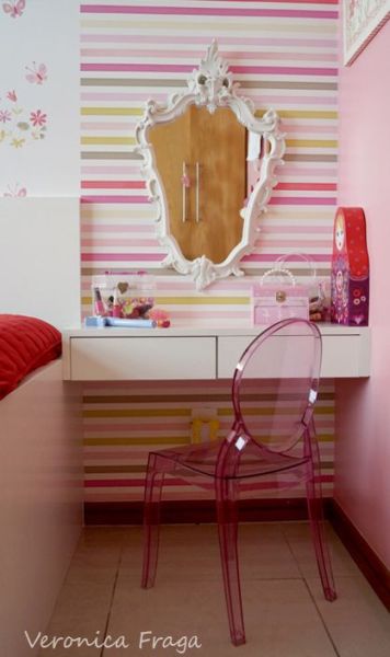 Vale delimitar o espaço de maquiagem com papel de parede ou tecido fixado na parede. Cores diferentes do restante das paredes do quarto ou do closet também criam o mesmo efeito.