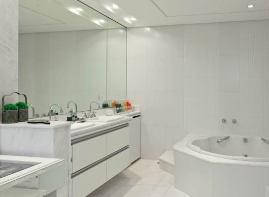 E se você posicionar um espelho na parede lateral a uma janela, a luz natural que entrar por esta janela será duplicada pelo espelho e seu banheiro parecerá mais espaçoso. E aposte também em armários e outros elementos espelhados e fixados na parede e altos do chão, para que também se crie ilusão de espaço maior, sem peças tomando a parede toda e chegando até o chão.