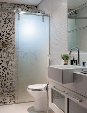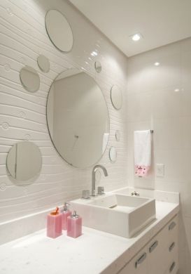 Ainda falando em espelho e seu efeito ampliador, você pode em uma parede inteira de seu banheiro, aplicar pastilhas espelhadas, pois elas irão criar o mesmo efeito que um espelho comum, com a grande vantagem de ainda trazer muito mais charme e modernidade para seu banheiro.