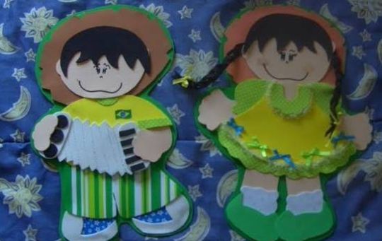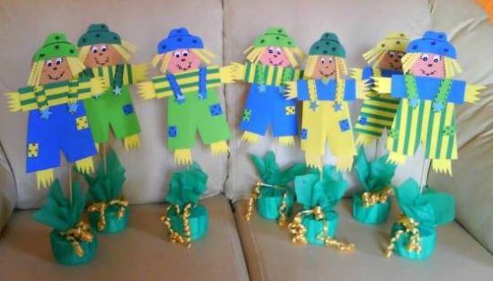 Se você for dar lembrancinhas em sua festa ou até mesmo para enfeitar as mesas dos convidados ou a mesa dos doces, você pode apostar em espantalhos vestidos com as cores do Brasil.