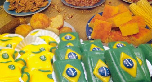 Até mesmo as comidas típicas que são servidas durante as festas juninas podem dividir o espaço na mesa com outros alimentos personalizados para a Copa do Mundo, contando com as cores da bandeira nacionais ou até mesmo tendo modelos de camisa da seleção brasileira ou da bandeira do Brasil.