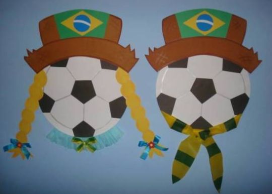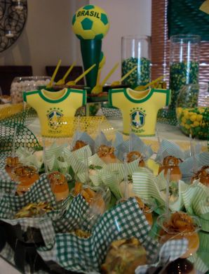 E até mesmo as portas dos banheiros ou para ficarem pregados nas paredes do salão, você pode fazer caipirinhas vestidos com o uniforme da seleção brasileira ou com as cores do Brasil. E a estrela do campeonato, a bola, também pode estar presente em sua festa.