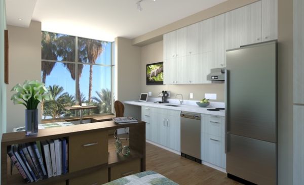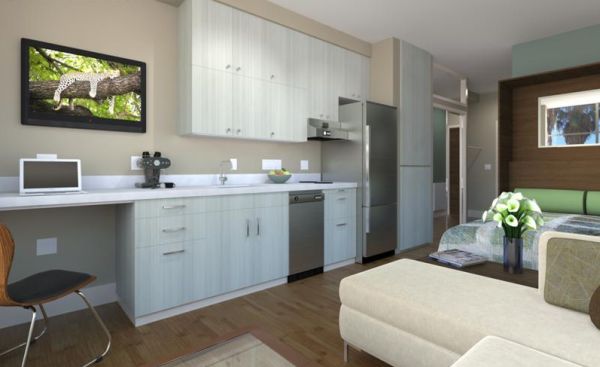 E como o espaço é mínimo, use e abuse os móveis e objetos funcionais, como camas que podem ser embutidas na parede quando você não estiver utilizando e em balcões ao longo da parede no lugar de mesas (que ocupam muito espaço), para servir tanto para fazer as refeições quanto para estudar ou trabalhar em casa.