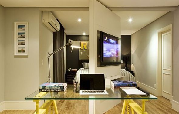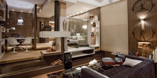 Outro item que faz o maior sucesso entre os que moram sozinhos e são independentes é a parede giratória, que serve para dividir os ambientes; e quando não se quer, basta deixá-la posicionada no centro do cômodo. E outra vantagem desta parede móvel é que se você posicionar sua TV você pode assisti-la nos dois ambientes e sem grandes esforços, apenas virando a parte com a TV para onde você se encontra.