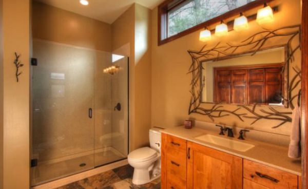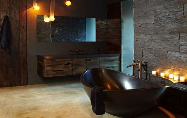 E você pode tanto conseguir visuais mais suaves para seu banheiro com o estilo rústico quanto alcançar visuais até mesmo com toques sofisticados e clima mais sombrio, quando se usa cores mais escuras e fechadas. E não se esqueça de investir também em uma bela iluminação artificial.