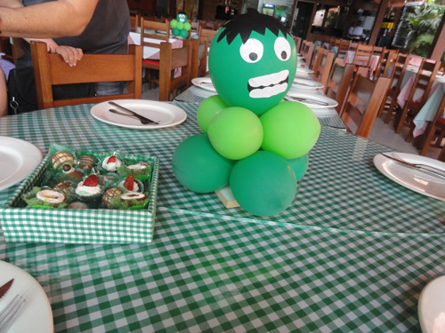 O centro de mesa da sua festa com o tema Incrível Hulk pode ser um Incrível Hulk estilizado e, feito com bexigas verdes e com o balão de cima pintado com o rosto do Hulk.