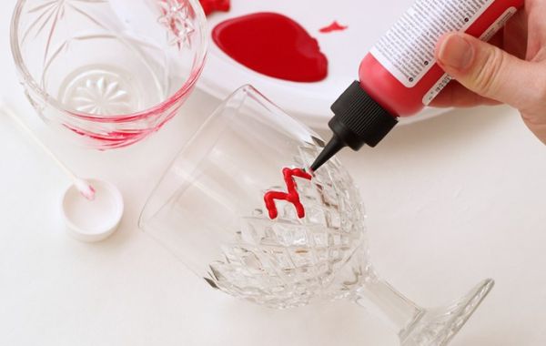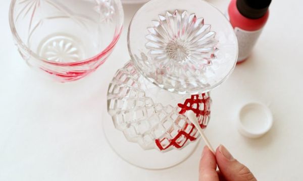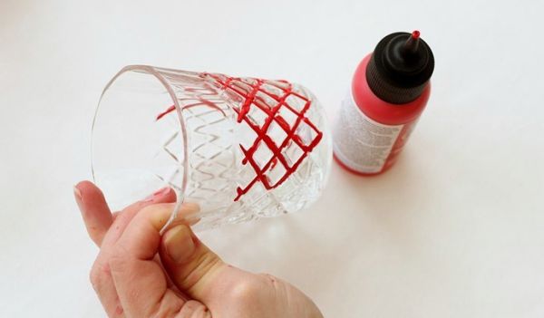 Comece limpando muito bem os copos com água e sabão e, depois com o álcool isopropílico em um pano de limpeza limpo e seco. Então, com o próprio bico da bisnaga da tinta ou com um pincel fino, dependendo da sua preferência, siga os motivos presentes no copo escolhido, ou então desenhe os motivos que você quiser por seu copo, e na posição que você quiser.