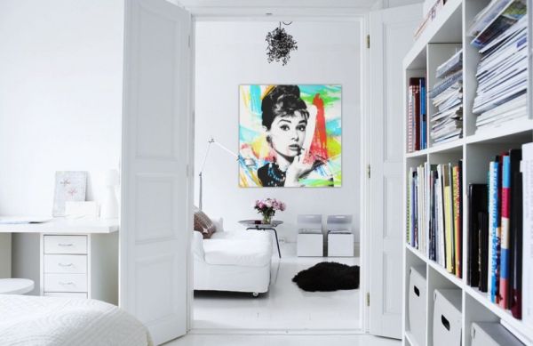 Quadro também é ótima opção para “ocupar” espaço em uma parede branca. E aqui você pode utilizar um único quadro grande ou utilizar vários quadros menores. E você também pode posicionar estes quadros em qualquer parte da parede branca.