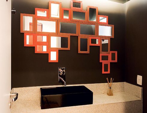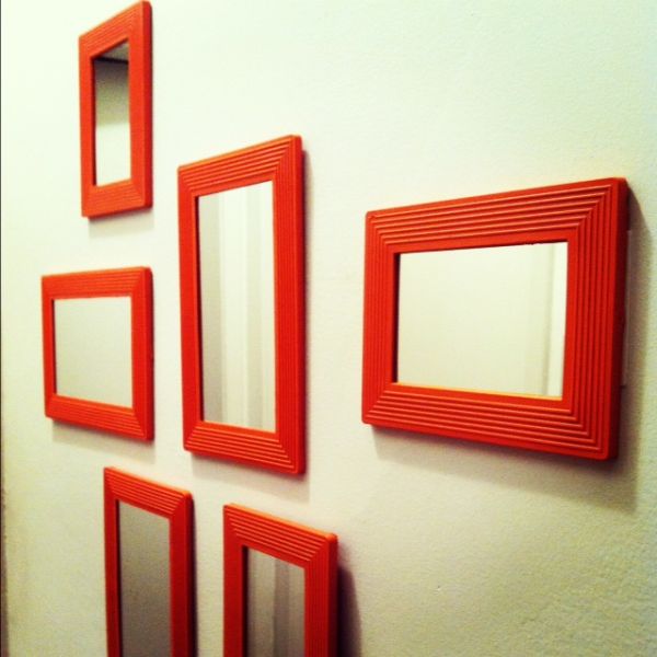 Uma variante da decoração mostrada anteriormente é a decoração utilizando os espelhos com moldura laranja, que são muito baratos e encontrados em qualquer loja popular, em uma parede de qualquer ambiente, mas deixando um espaço entre um espelho e outro e não juntos.