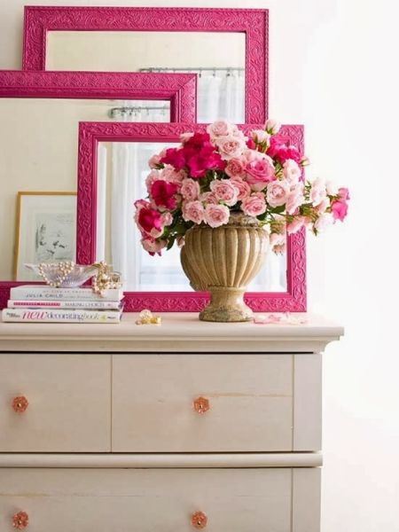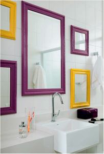 Se você quiser customizar a moldura do seu espelho antes de utilizá-la, pinte-a com uma cor vibrante e intensa de sua preferência. Você pode acomodar vários espelhos juntos, sobre um móvel, por exemplo, para conseguir um efeito bem especial para o seu cômodo. E se você quiser, pode aplicar algo ou fazer uma customização mais elaborada nas molduras, como aplicar cola quente ou outro material que fique em alto-relevo, formando motivos, antes de pintar a moldura.