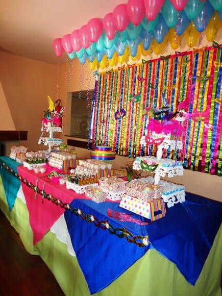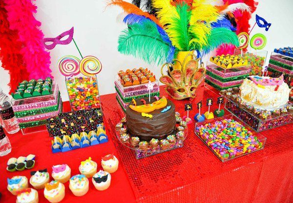 A decoração para festa com o tema carnaval pode ser bem exagerada, com muitas cores intensas usadas juntas e muitos brilhos nos acessórios. A mesa para os doces, para as bebidas ou para o bolo pode ser revestida com toalhas ou papéis coloridos e brilhantes. Os docinhos também podem receber detalhes bem coloridos ou brilhantes, como forminhas feitas com papéis chamativos ou confeitos bem coloridos e chamativos.