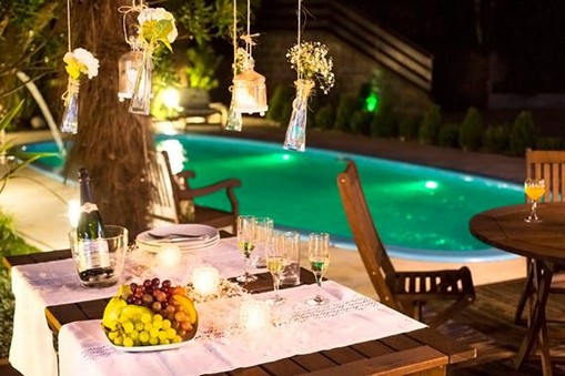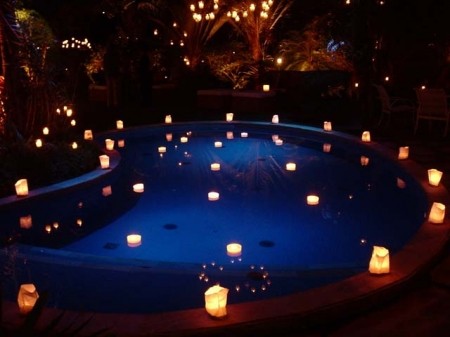 Fazer uma borda na piscina com algumas velas é perfeito para a festa de réveillon, uma festa que segundo as tradições é necessário ter muita iluminação no ambiente. Capriche nos suportes para as velas e acomode-os ao redor de toda a sua piscina, mantendo uma distância simétrica entre uma vela e outra.