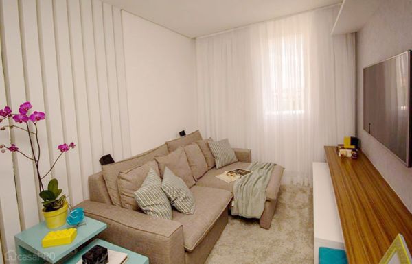 Investir em cores claras para toda a decoração da sua sala, assim como empregar tons claros também nas paredes, teto e chão, é ótima opção para criar uma ilusão visual de sala maior, pois cores claras tendem a ampliar visualmente o cômodo onde estão empregadas.