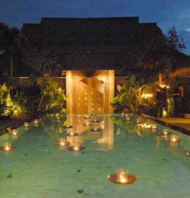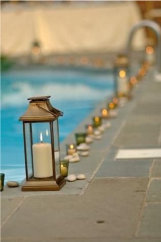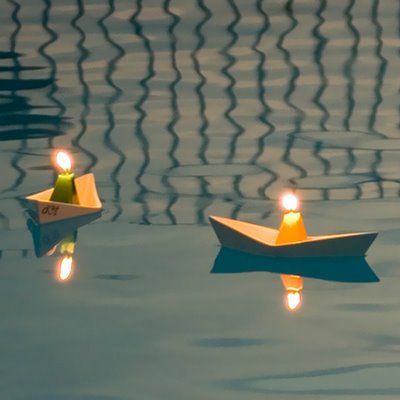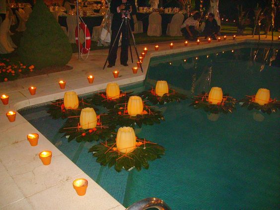 Dentro da piscina você pode colocar barquinhos de papel ou de plástico com velas, para criar efeitos luminosos bem interessantes em sua piscina.