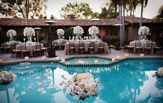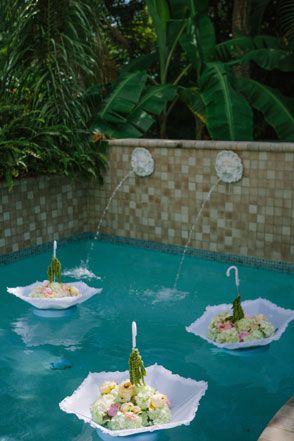 Vale também colocar dentro da piscina arcos enfeitados com flores de sua preferência. Lembrando que estas flores devem também estar presentes no restante da decoração.