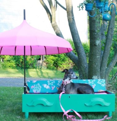 Ainda falando da parte externa de sua casa seu jardim ficará muito mais colorido e seu animalzinho de estimação ficará muito mais feliz se você reutilizar uma gaveta como caminha para seu bicinho. E para arrematar o visual, acrescente um guarda-sol bem colorido.