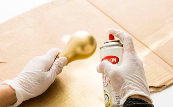 Comece pintando algumas lâmpadas queimadas com a tinta spray dourada. E antes de iniciar a pintura, proteja a parte de metal de sua lâmpada com pedaços de fita adesiva.