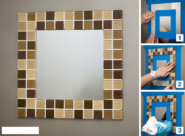 A moldura do espelho feita por você, de maneira artesanal, é ainda mais interessante, pois reflete o seu estilo e a sua personalidade. Você pode fixar tiras de pastilhas adesivas em um espelho, para criar uma moldura. Proteja a parte interna e a borda do espelho, antes de aplicar a pastilha. E ao final, coloque rejunte nas reentrâncias, para fazer um bom acabamento. Qualquer tamanho de espelho pode receber esta moldura.