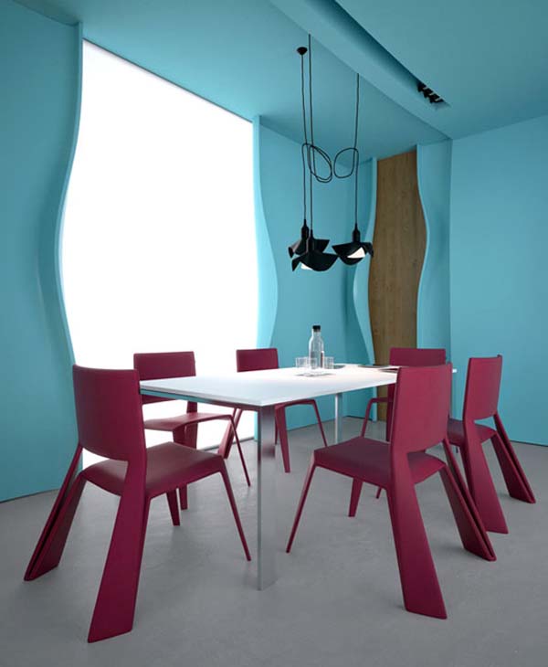Para quem não tem medo de errar, essa é uma sala de jantar multicolorida, com cadeiras pink, parede azul e detalhes em preto e branco. Em ambientes muito coloridos, é melhor não abusar de objetos em excesso. Escolha objetos com linhas retas para combinar com os mais ousados.