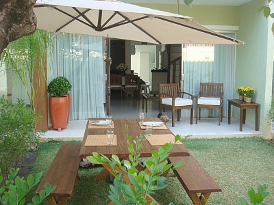 Para áreas avarandadas da casa ou quintal, que tal deixar uma mesa grande para almoços e refeições à tarde ou para receber amigos? Veja como é uma composição simples e agradável. Cadeiras de madeira e uma mesinha fazem o estilo de um pequena sala de descanso ao ar livre.