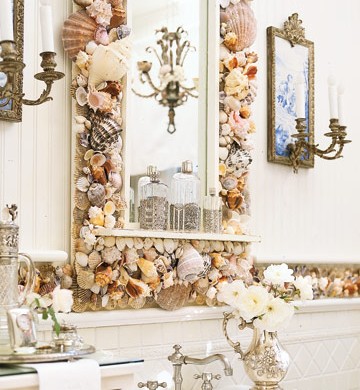 Para criar banheiros diferentes e marcantes, esta decoração é a melhor opção. O espelho e a faixinha do banheiro foram cobertas por conchinhas de praia. Decoração barata e simples de fazer. Para a bancada, lindos jarros de água de prata exibem flores brancas delicadas. Decore sua casa sem medos e preocupações.