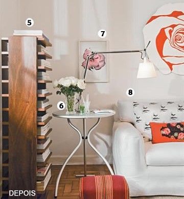 4 – Uma mesa lateral antiga – comprada em um antiquário – serviu para preencher as cores do ambiente e também para dar suporte as revistas.