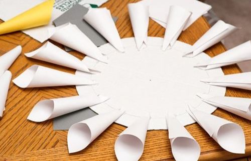 Em seguida, faça cones com todos os seus quadrados, colando as extremidades com o auxílio da pistola de cola quente. Depois basta começar a posicionar e colar estes cones sobre o círculo de papelão, que deve ter um furo no centro, para você poder pendurar posteriormente, começando a colar com a cor branca e intercalando os cones, colando a primeira fileira com um espaço entre um cone e outro e colando a segunda fileira nestes espaços deixados anteriormente.