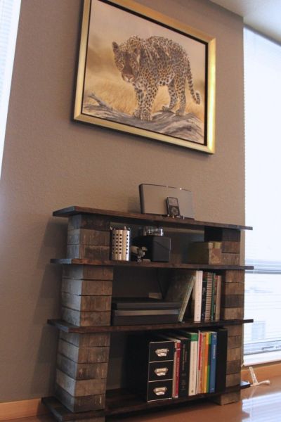 Agora, para finalizar a sua peça, escolha uma parede de sua preferência e comece a montar a sua estante, posicionando dois blocos de concreto, um de cada lado, e por cima uma tábua. Depois basta ir seguindo posicionando blocos de concreto e tábuas até chegar à altura desejada. E está pronto!