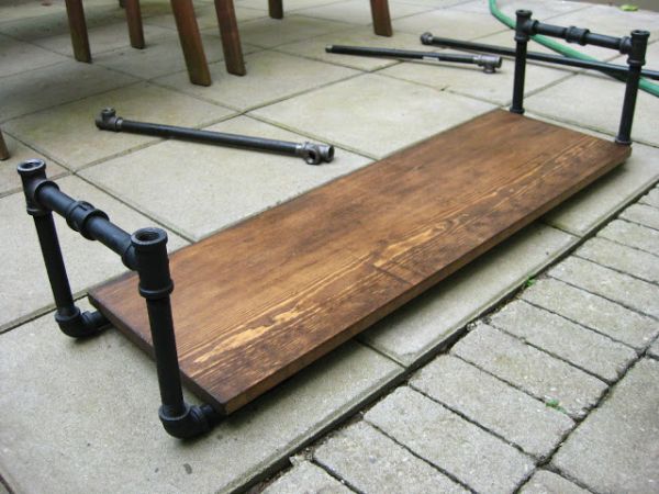 Em seguida, corte os pedaços de cano com o tamanho que você quer para o seu carrinho bar e comece a montar o seu carrinho, fixando os pedaços de cano nas placas de madeira, com o auxílio da abraçadeira de metal e de alguns parafusos.