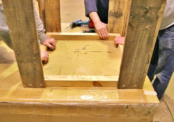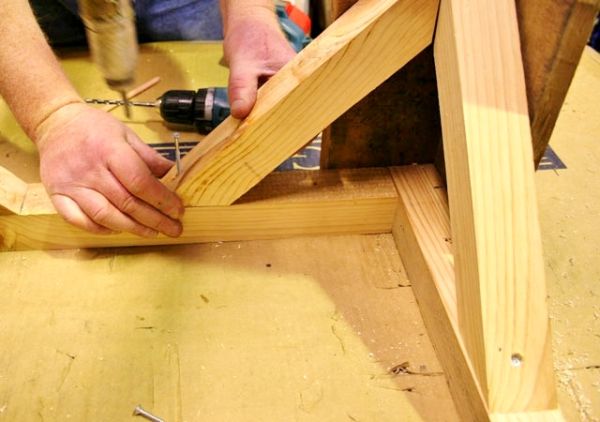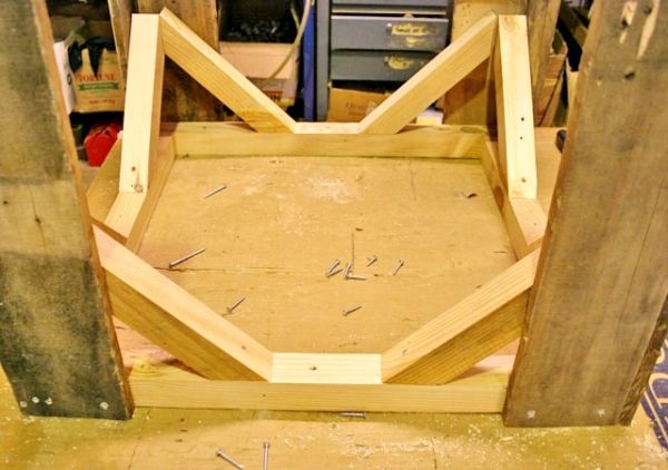 Em seguida, fixe os pés de sua mesa, também feitos com pedaços de madeira.