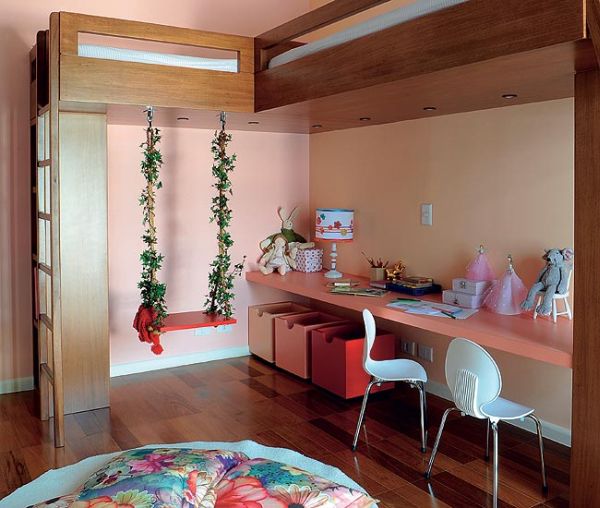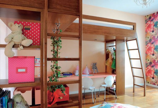 No quarto das garotas é possível acomodar até mesmo um armário na parte que ficará embaixo da cama suspensa, para otimizar ainda mais todo o cômodo. Escrivaninha com tampo que se prolonga até chegar à parede e ainda cria a base para uma miniestante ou prateleira é também ótima opção para acrescentar ao quarto que possua cama suspensa.