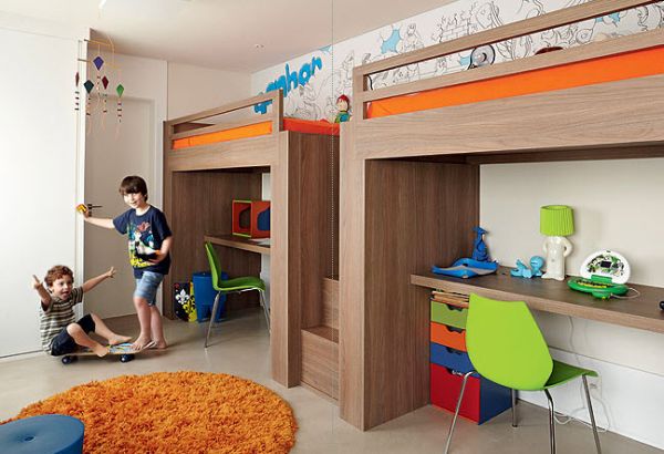 Quarto que acomode dois irmãos também fica com o espaço otimizado com camas suspensa, que acomodem embaixo delas escrivaninhas, gaveteiros e prateleiras, para guardar o que as suas crianças quiserem.
