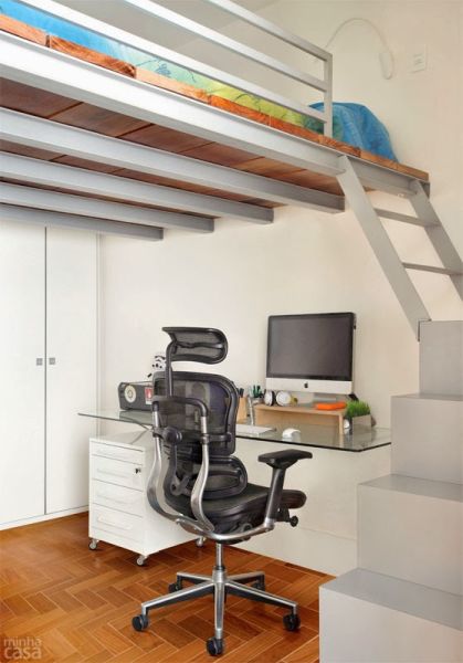 A cama suspensa pode ser fixada em um canto para criar na parte debaixo um home office ou um cantinho de leitura.