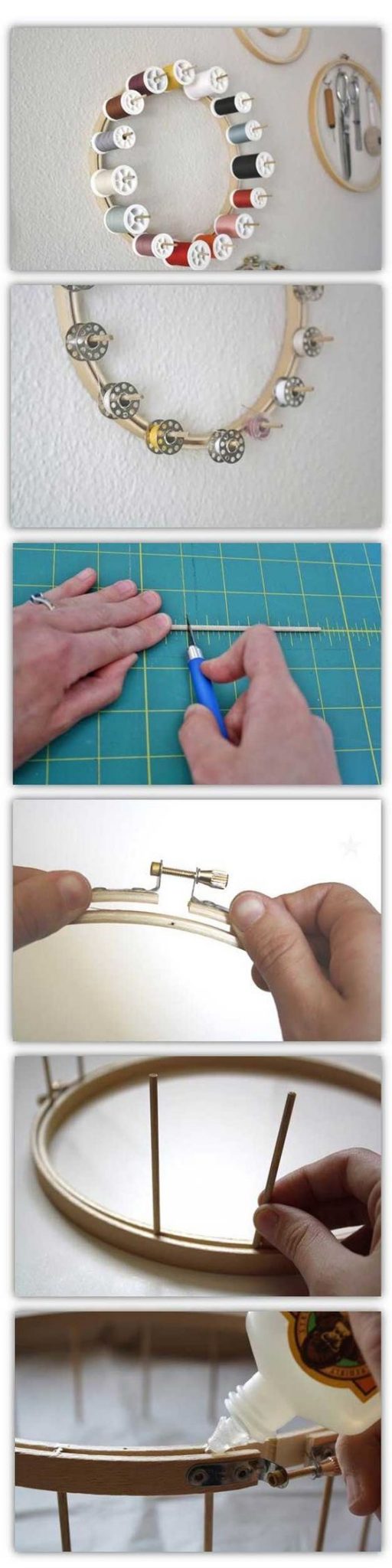 Comece separando todos os materiais que você vai utilizar em seu artesanato. Corte os palitos de madeira com tamanhos iguais e que consigam acomodar os carretéis de linha. Corte quantos pedaços de palito de madeira você quiser. Abra um pouco do parafuso do bastidor para bordado até conseguir um espaço que consiga acomodar os pedaços de palitos de madeira sem deixá-los cair. Comece a posicionar os pedaços de madeira ao redor de todo o bastidor, encaixando no espaço deixado. Ao final do trabalho, aplique cola tudo na base dos pedaços de palito de madeira, para evitar que se soltem com o passar do tempo. E está pronto!