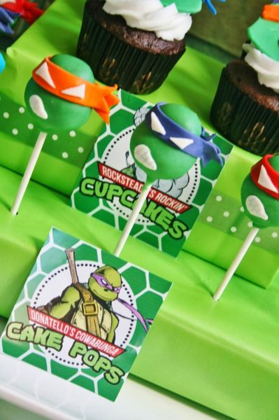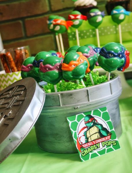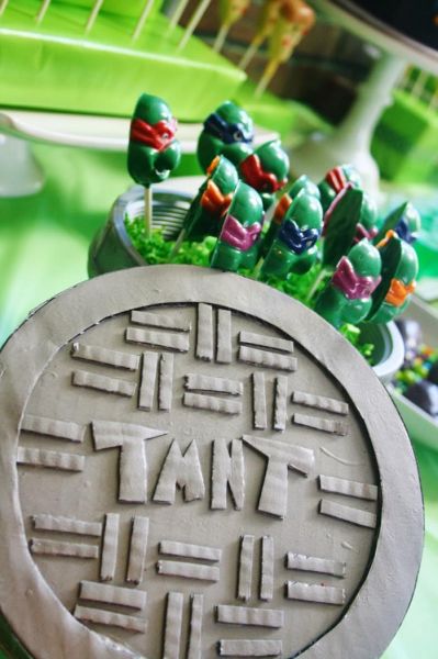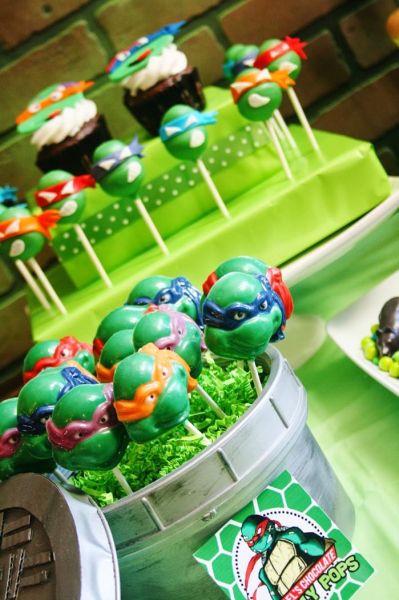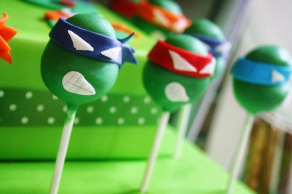 Ainda falando sobre alimentos que serão servidos em sua festa, vale até mesmo decorar pirulitos verdes com as carinhas das Tartarugas Ninjas.