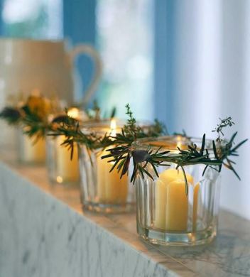 As velas são peças que sempre estão presentes na época do Natal e você pode enfeitar as suas velas de forma rápida. Posicione folha verdes ao redor da sua vela com o auxílio de um elástico e decore com fita.