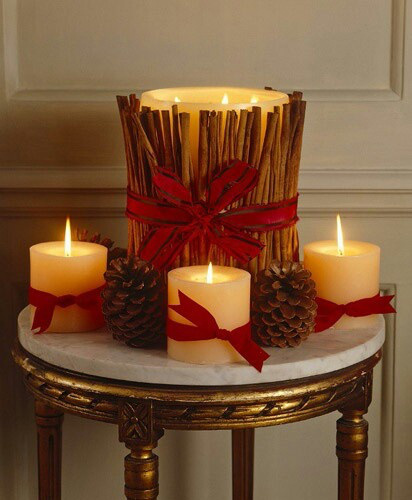 Posicione canela em pau, galhos secos ou uma fita com laço em suas velas, para decorá-las. Estas são fáceis opções para decorar as suas velas e, consequentemente, toda a sua casa durante o Natal.