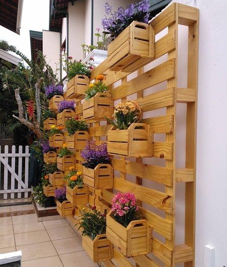 Se você não estiver querendo gastar muito para montar o seu jardim vertical na área externa de seu lar você pode investir em caixotes de madeira, que são baratos ou que não irão custar nada, caso você já os tenha em casa ou algum comerciante dê para você. Você pode ainda montar uma estrutura com paletes, que também são muito baratas, para fixar os seus caixotes de madeira caso não queira fixá-los diretamente no muro, ou fixar os caixotes no muro de sua casa, com o auxílio de buchas para parafusos e parafusos grandes. Você pode deixar a madeira com aparência original ou aplicar verniz com o tom de sua preferência em todas as peças de madeira.