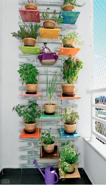 Escadas e prateleiras comuns podem também servirem como base para o seu jardim vertical na área externa de sua casa. As peças podem ou não estarem customizadas, de acordo com a sua preferência.