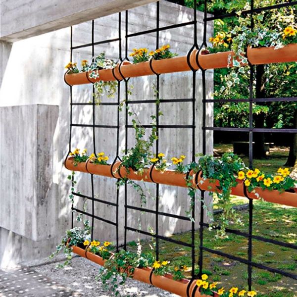 Quem gosta de itens elaborados pode apostar em um jardim vertical com modelo de grade e feito com canos e estrutura que acomoda os canos com perfeição.