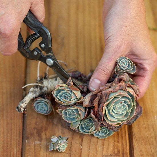 Em seguida, corte peto da base das suculentas, mas deixando a raiz. Separe as outras plantinhas que você vai utilizar.