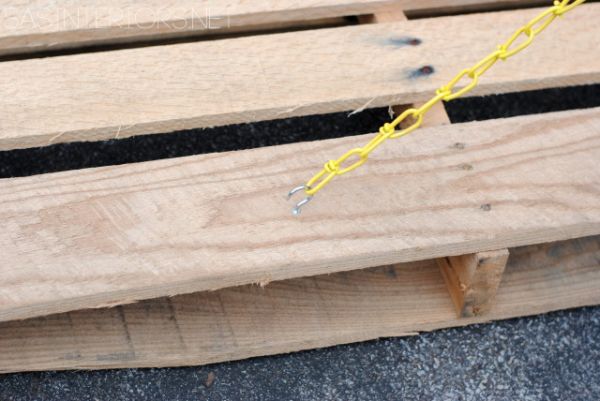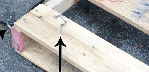 Em seguida, fure as partes das pallets onde você irá colocar os ganchos para pendurar as partes de sua mesa. E depois fixe os ganchos nas partes onde você vai posicionar as correntes ao final de seu trabalho.
