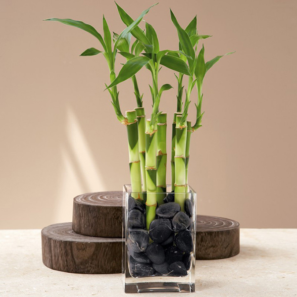 O bambu da sorte pode ser colocado até no banheiro, pois adora umidade. A rega deve ser constante, mas evite deixar esta planta em contato direto com o sol.