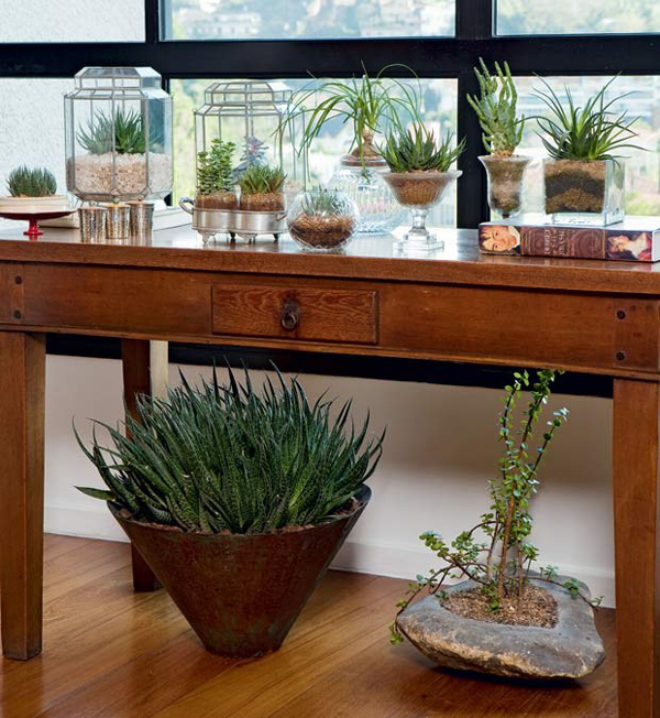 As suculentas são muito usadas atualmente, seja em vasos ou em terrários, pois exigem poucos cuidados e irrigação rara. Mas precisam de ao menos 4 horas de exposição ao sol.