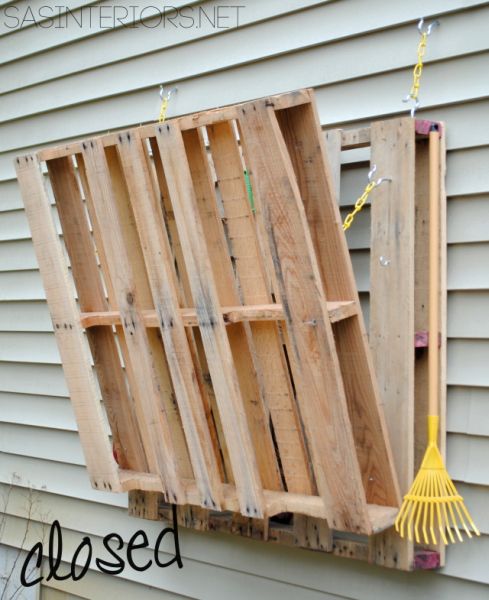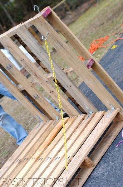Comece furando as partes das pallets onde você irá colocar os ganchos para pendurar as partes de sua prateleira. E depois fixe os ganchos nas partes onde você vai posicionar as correntes ao final de seu trabalho.