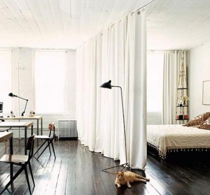 A maneira mais fácil e rápida de separar os ambientes de uma quitinete é com uma cortina. Basta fixar o suporte no teto ou nas paredes laterais do espaço e acomodar uma cortina confeccionada com tecido bem espesso, para separar definitivamente os ambientes, ou optar por cortinas semitransparentes, para separar de forma suave os espaços.