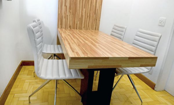 Quando você investir em um ambiente com piso de madeira você também pode acrescentar à decoração mais elementos confeccionados com madeira. Em caso de sala de jantar bem pequena, você pode apostar sem medos em piso revestido com madeira e mesa também confeccionada com madeira, além de poder ainda incorporar um detalhe na vertical na parede com madeira (que alonga visualmente o ambiente), para assim criar um clima bem intimista em sua sala de jantar, já que a madeira tem esta característica, de transformar qualquer ambiente mais “frio” em espaço acolhedor e aconchegante.