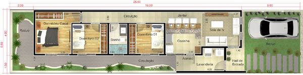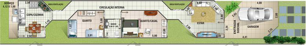 Mesmo em caso de terrenos muito estreitos o projeto pode acomodar uma garagem e ainda cômodos suficientes para que toda família fique confortável. Neste caso o projeto deve primar por um modelo de casa que também siga o formato do terreno, que também seja comprida e estreita. Um cômodo deve ficar atrás do outro neste projeto, mas de forma que mantenha a harmonia de toda a casa.